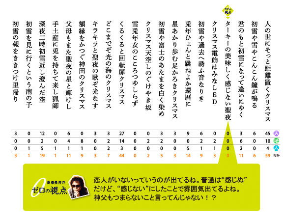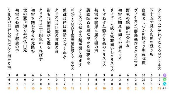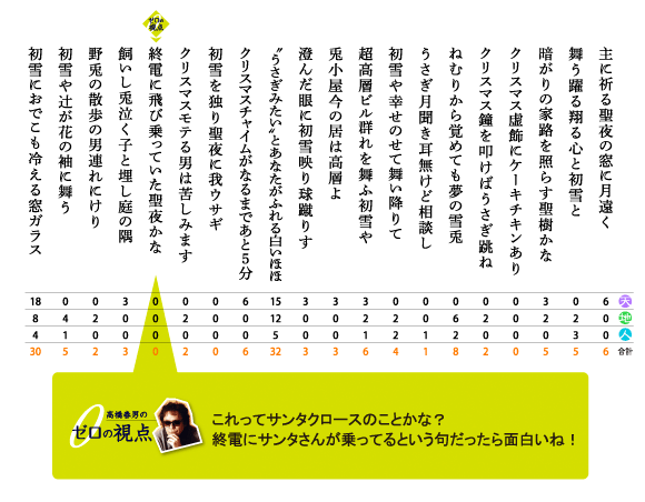2010年11月30日(火)に開催されたHaikuヌーヴォー!で行われた300人句会にて投句、選句いただいた皆様、ありがとうございました!天 → 3点 地 → 2点 人 → 1点、各人の持ち点の合計点で各賞を決定いたしました。